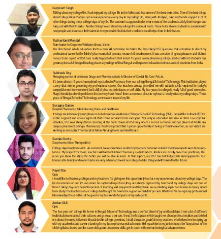 It's been almost 12 years I completed my studies in Pharmacy from our college Bengal School of Technology. This institution played a very vital role in grooming my professional career. Our teachers always provided me with suitable skills required for today's competitive work environment be it skill of pharma techniques or soft skills. My four years in college is really full of good memories. Many friendships developed there & to be very frank few of them are now so close to my heart. I really miss my college days. Those years of Bengal School of Technology are treasure trove of my life.
